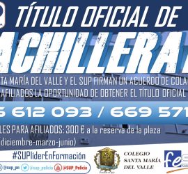 El Colegio Santa María del Valle ha llegado a un acuerdo de colaboración con el Sindicato Unificado de Policía, SUP, para ofrecer a todos sus afiliados la oportunidad de sacarse el título oficial de bachillerato. Dependiendo de la titulación previa, se podrá obtener el título, en uno o dos […]