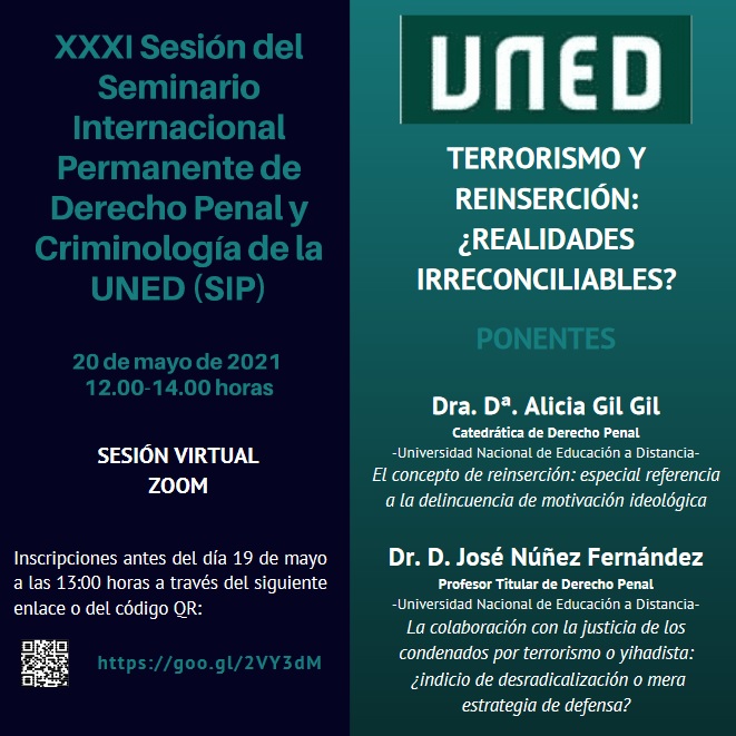 A cargo de los ponentes: Dra. Alicia Gil Gil, Catedrática de Derecho Penal de la UNED, con el título «El concepto de reinserción: especial referencia a la delincuencia de motivación ideológica»; y el Dr. José Núñez Fernández, Profesor Titular de Derecho Penal de la UNED, bajo el título «La colaboración con la justicia de los condenados por terrorismo yihadista: ¿indicio de desradicalización o mera estrategia de defensa?».