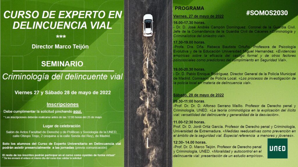 La UNED invita a los afiliados/as al SUP al Seminario sobre La Criminología Vial que se va a celebrar el próximo viernes día 27 (tarde) y 28 (mañana) de mayo