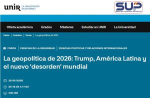 Te invitamos al primer evento del FORO UNIR con un tema muy actual “La geopolítica de 2026: Trump, América Latina y nuevo ‘desorden’ mundial”, que tendrá lugar el próximo día 20 de enero a las 16:00 hora peninsular.