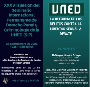 La próxima XXXVIII sesión del Seminario Internacional Permanente de Derecho penal y Criminología, se celebrará el día 22 de diciembre de 2022, jueves, de 12:00 a 14:00 horas, en sesión presencial y virtual.