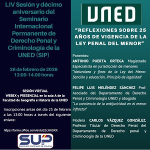 La próxima LIV sesión del Seminario Internacional Permanente de Derecho penal y Criminología se celebrará el día 26 de febrero de 2026, jueves, de 12:00 a 14:00 horas, en sesión presencial en la Sala A de la Facultad de Geografía e Historia en el edificio de Humanidades de la Uned ( Calle Senda del Rey, 7 28040 Madrid) y virtual por ZOOM, con el siguiente programa: