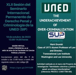La Facultad de Derecho de la UNED invita a las afiliadas y los afiliados al SUP a la próxima XLII sesión del Seminario Internacional Permanente de Derecho penal y Criminología, que se celebrará el día 10 de octubre de 2023, martes, de 12:00 a 14:00 horas, en sesión presencial y virtual, con el siguiente programa:
