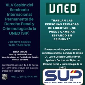 La Facultad de Derecho de la UNED invita a las afiliadas y los afiliados al SUP a la próxima XLV sesión del Seminario Internacional Permanente de Derecho penal y Criminología, que se celebrará el día 7 de mayo de 2024, martes, de 12:00 a 14:00 horas, en sesión presencial y virtual, con el siguiente programa: